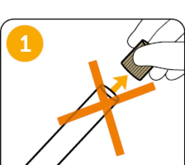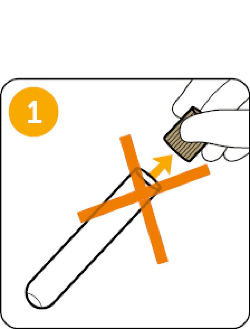 Ga niet met een vinger onder de sticker, hieronder zit een scherpe naald.